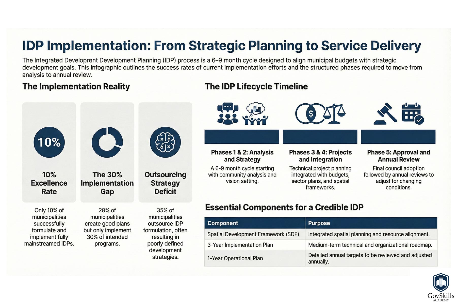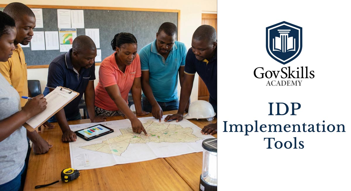 The “IDP – Implementation Tools” course focuses on how municipalities transition from strategic planning to concrete service delivery. It covers the essential management systems, financial frameworks, and monitoring mechanisms required to execute an Integrated Development Plan (IDP) effectively.