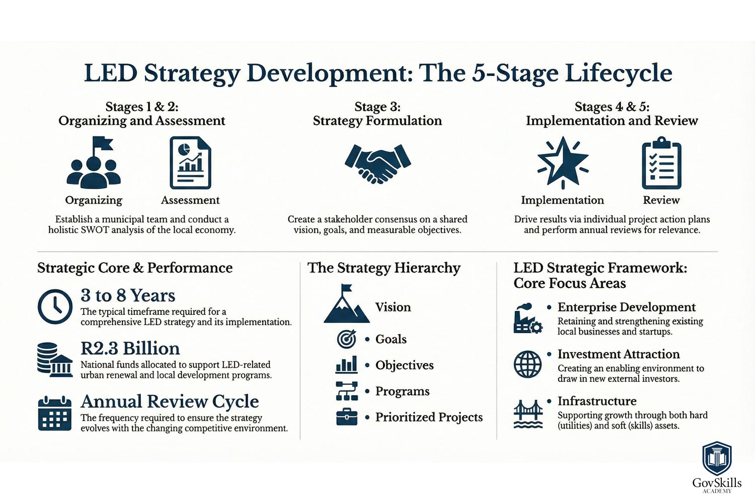 The National Framework for Local Economic Development (LED) in South Africa provides the strategic foundation for building robust, inclusive, and competitive local economies. The framework shifts the focus of LED from isolated, ad-hoc poverty-alleviation projects to a more strategic, systemic approach driven by two primary policy thrusts: Public Sector Leadership and Governance, and Sustainable Community Investment Programmes.